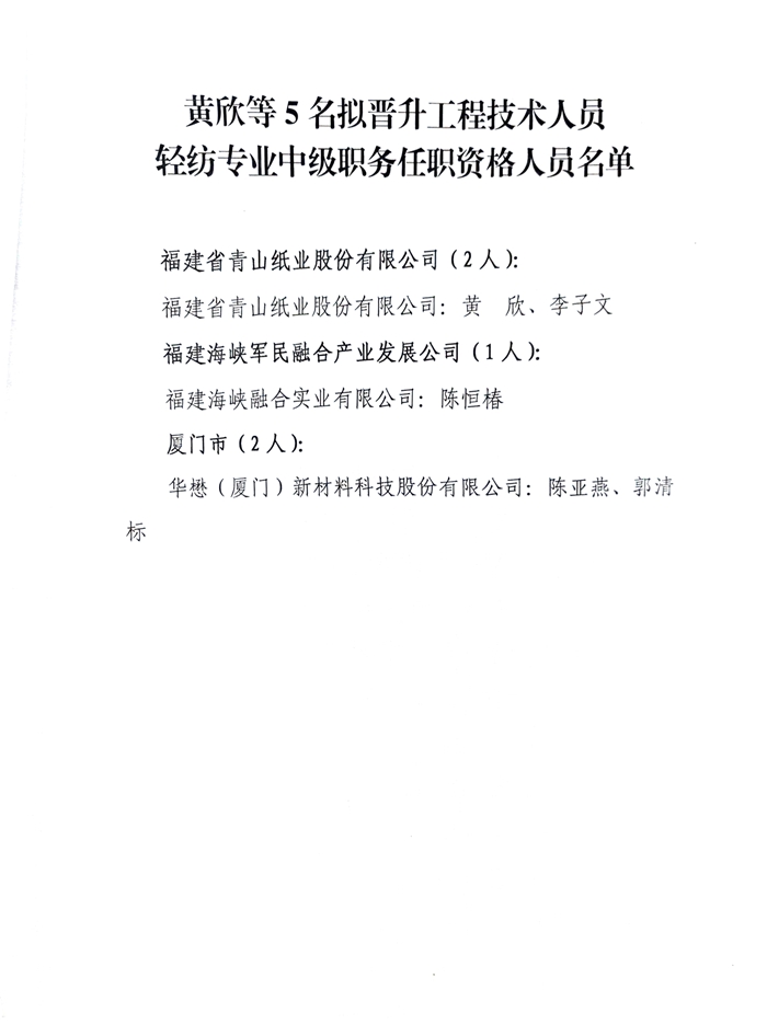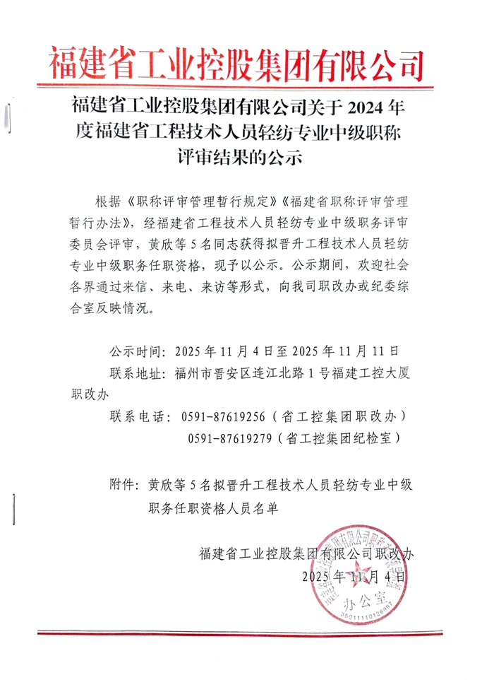 福建省工業(yè)控股集團(tuán)有限公司關(guān)于2024年度福建省工程技術(shù)人員輕紡專業(yè)中級職稱評審結(jié)果的公示